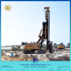 Al Bustan Land Dewatering L.L.C. executed complete Sheet Pile Shoring works to support excavation for foundation and basement construction in challenging ground conditions. The shoring design was developed considering soil properties, groundwater pressure, and adjacent structures, ensuring compliance with UAE construction safety standards.